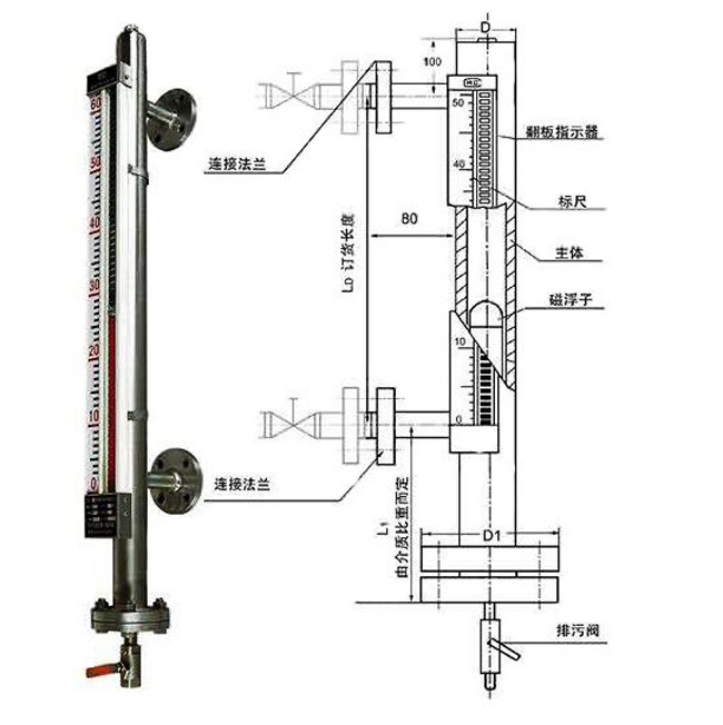 液位計根據浮力原理和磁性耦合作用而成。當被測容器中的液位升降時(shí),液位計主導管中的浮子也隨之升降,浮子內的磁鋼通過(guò)磁耦合傳遞到現場(chǎng)指示器,驅動(dòng)紅、白翻柱翻轉180。,當液位上升時(shí),翻柱由白色轉為紅色,當液位下降時(shí),翻柱由紅色轉為白色,指示器的紅、白界位處為容器內介質(zhì)液位的實(shí)際高度,從而實(shí)現液位的指示。